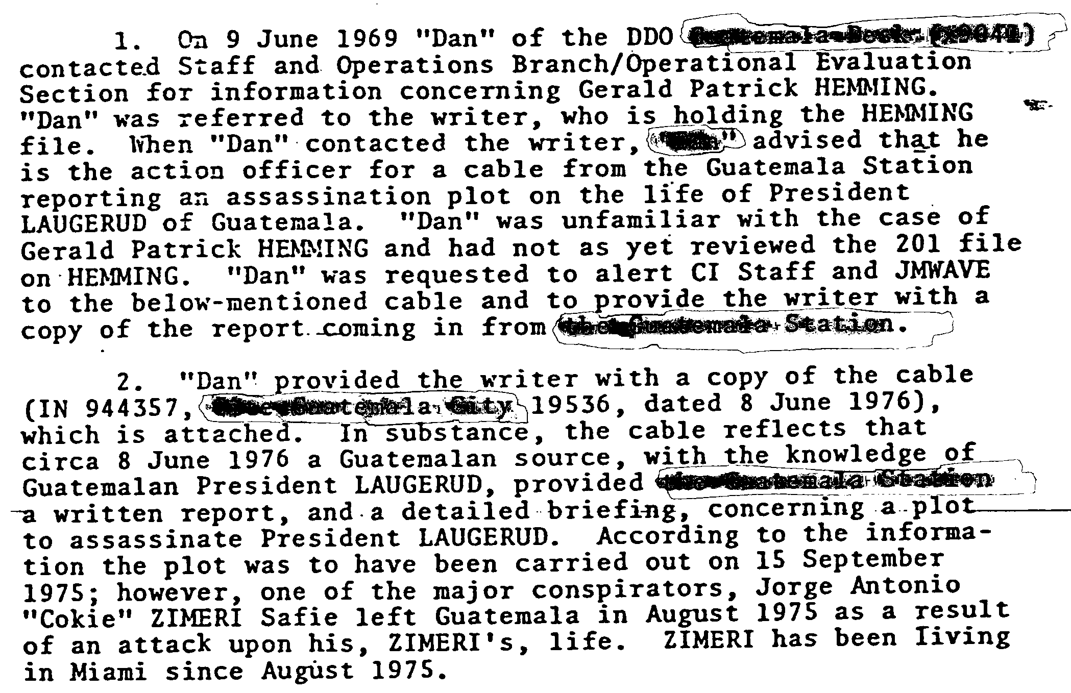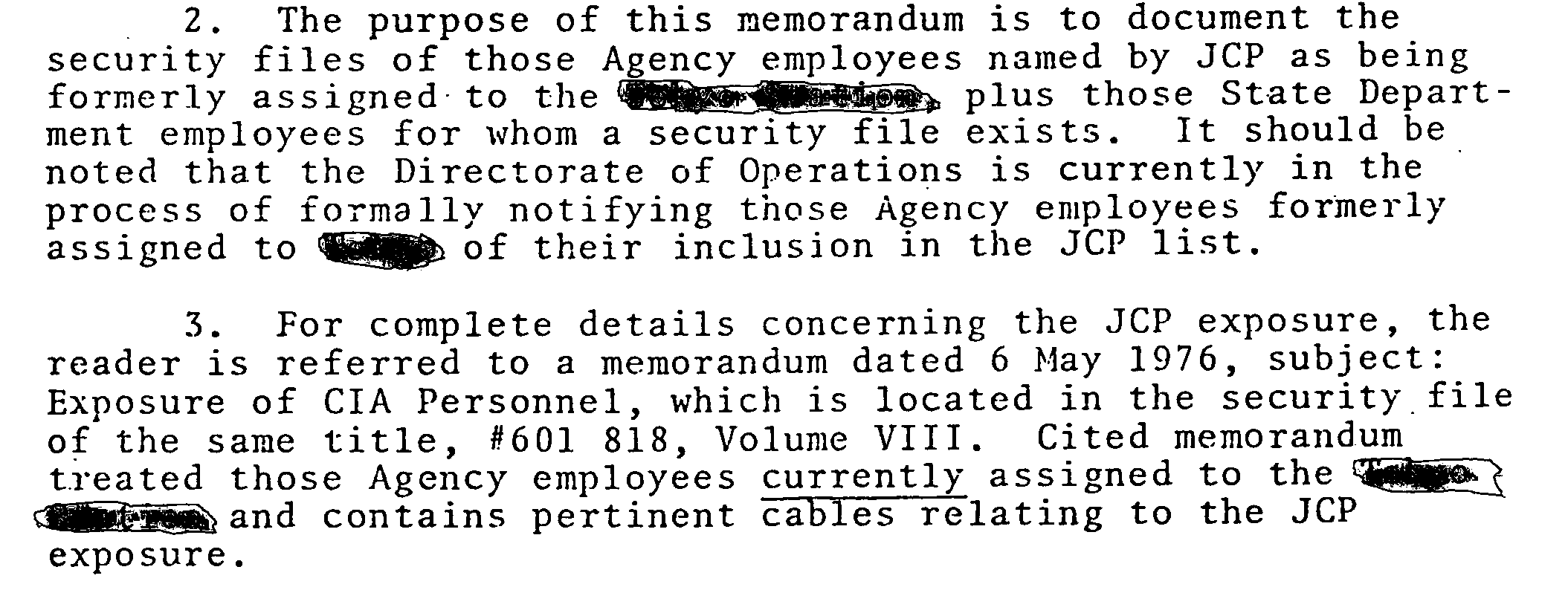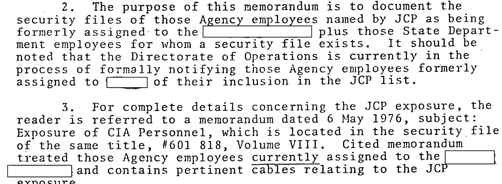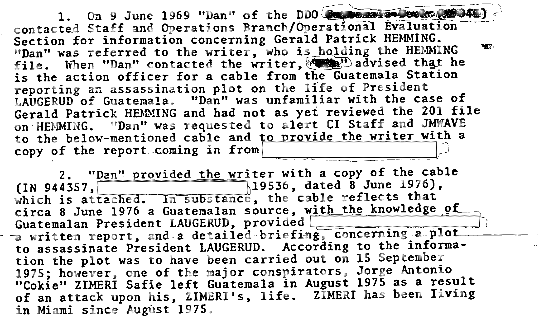 It was created from the same memo, but names and locations were omitted, with a numbered added where they were and lower on the page a list was added to explain what the numbers mean. However, the doc still used the phrase “Guatemala Station”, and this phrase was later blocked out with redaction boxes.